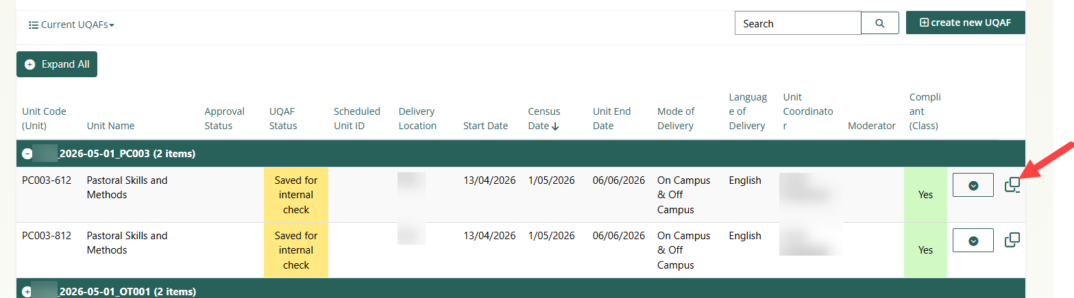 If available, choose the corresponding unit code and the most recent version of the UQAF. The clone will have the field values of the 'original UQAF' and will also show the delivery details and the moderator's comments of the 'original UQAF. The ideas is that it feeds back into the design of the new unit delivery.