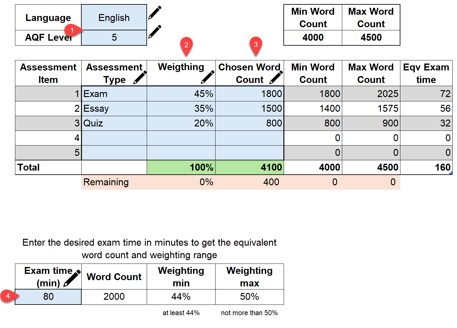 - Enter Exam Time: Calculates the equivalent word count and suggests a weighting range.
